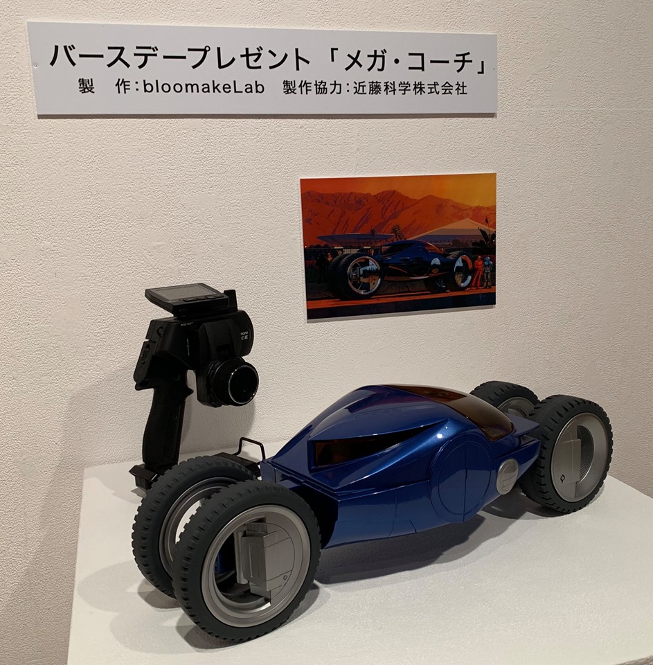 プレゼントは、シドミードデザインの「メガコーチ」を立体化したRCカーです。製作者はbloomakeLabの吉村さん。吉村さんは、近藤科学のKHRシリーズや株式会社バンダイのZEONIC TECHNICSのモデルデザインなど多彩なロボットデザインで活躍されています。