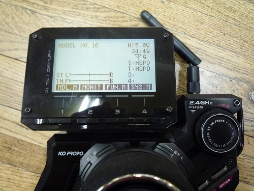 今回のシャーシでは切れ角が少なすぎるようです。これでは性能が生かされない状態ですので、要調整ですね。トラベル機能は、ステアリングを切ったときのサーボの動作量を左右一緒に増減する機能です。もし、RCカーのステアリングが全部切れてしまってステアリングサーボが唸って「ウイーン」となった場合は、すぐにプロポのステアリングを戻してトラベルの数値を減らす方向に設定します。