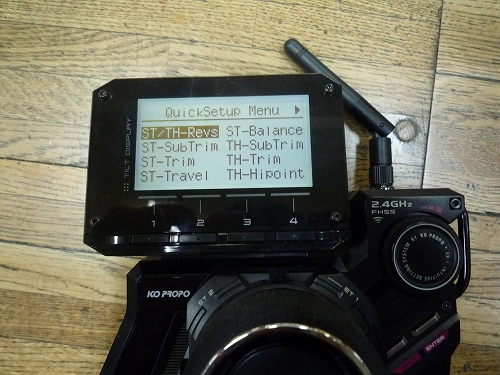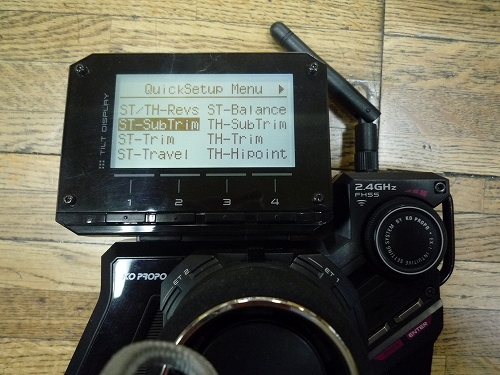 先ほどの【Reverse】の画面よりBACKキーを一度押し、【QuickSetup Menu】画面に戻り、今度はカーソルを”ST-SubTrim”に合わせてENTERを押します。