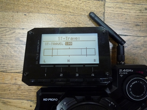 先ほどの【ST-SubTrim】の画面より、BACKキーを押して【QuickSetup Menu】画面に戻り、今度は”ST-Travel">ENTと進みます。