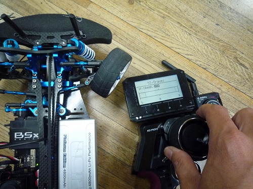 また、ハンドルを右に切るとタイヤは左に曲がってしまいました。これはマシンによって サーボの搭載向きが変わるためにおこりますが、リバース機能をセッティング変更するだけで簡単に直せます。状況がわかったところでEX-1のクイックセットアップで調整していきましょう。