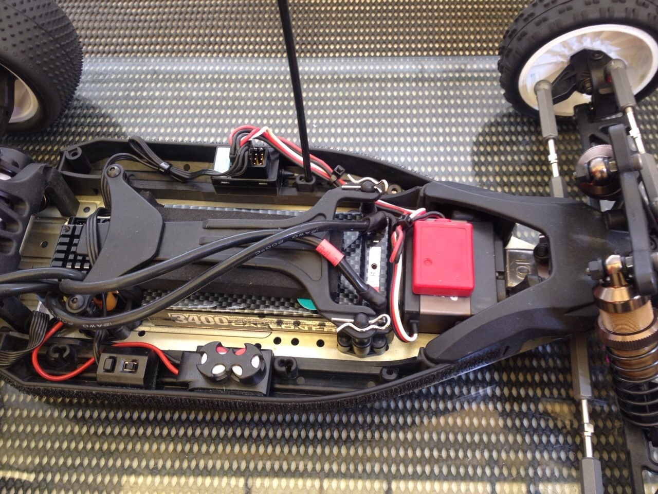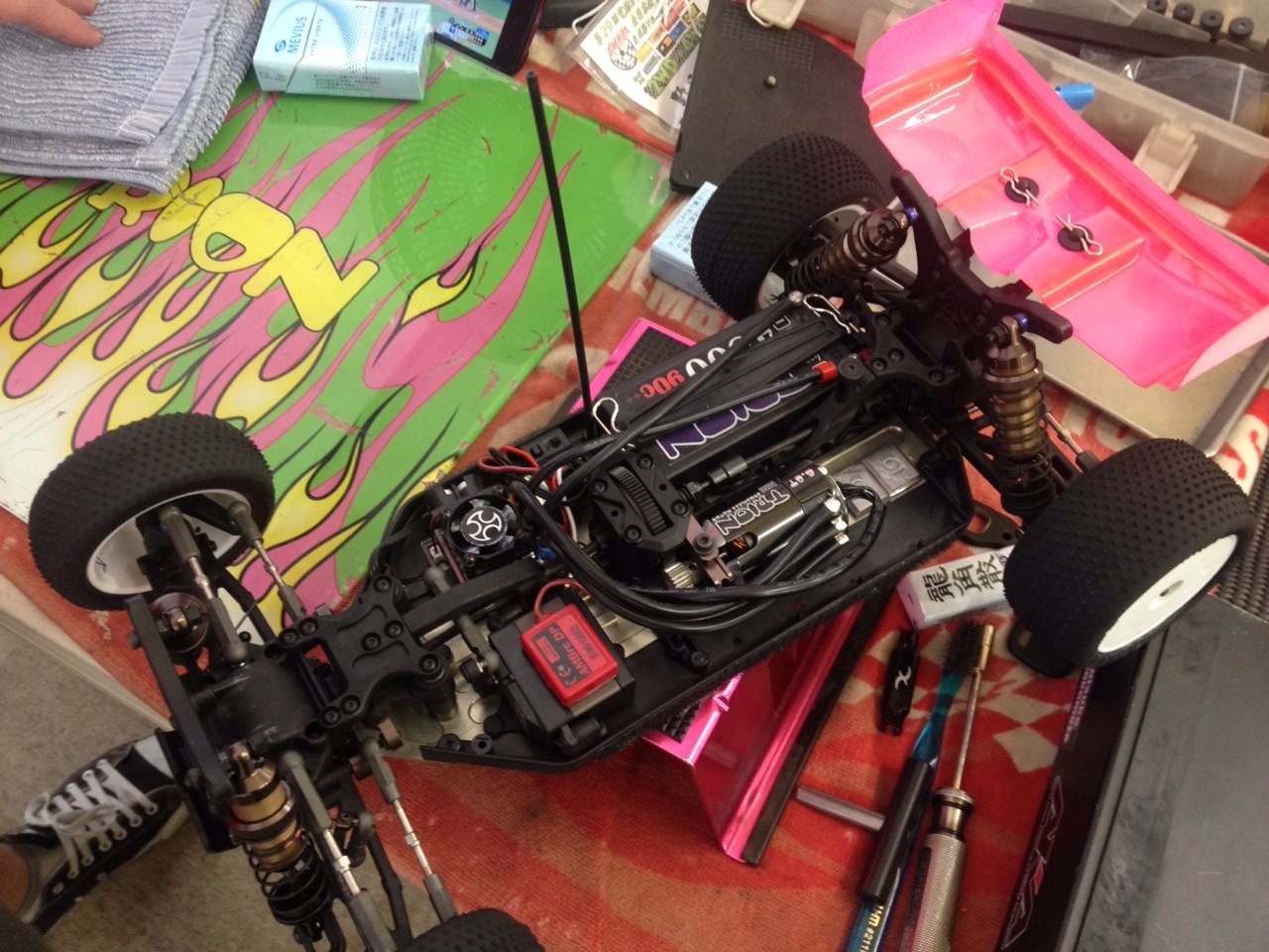 同じく、坂本選手の4WDクラス出走マシンZX6です。1/8エンジンバギー同様のアルミシャーシに樹脂製のステフナーでシャーシ剛性を確保した最新のシャーシです。